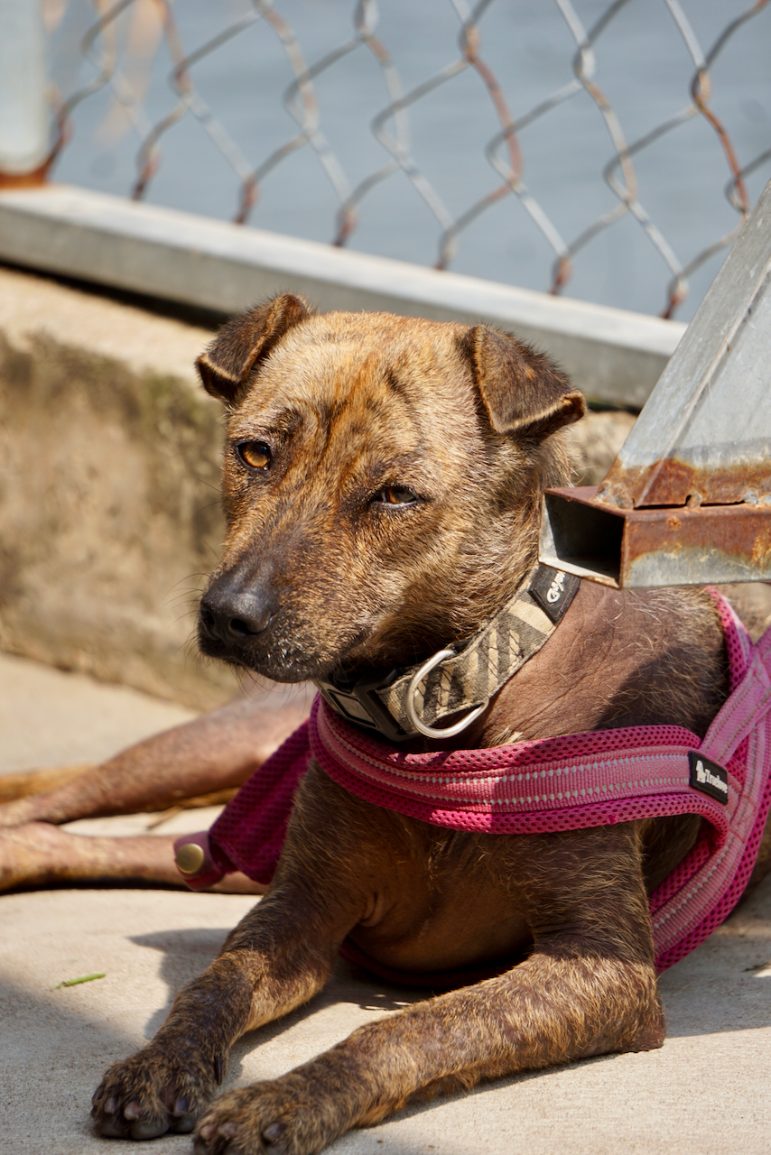 Sandy, a resilient and loving dog, has triumphed over a challenging start to life. Rescued from a motorbike mechanic shop in Thao Dien, she was battling severe demodex and a broken leg. Despite her difficult beginnings, Sandy has not only recovered physically but has also regained her trust in humans, making great strides in her journey to resilience. Despite having a permanent limp on her back leg, she isn't in any pain and absolutely loves going for walks with her humans.